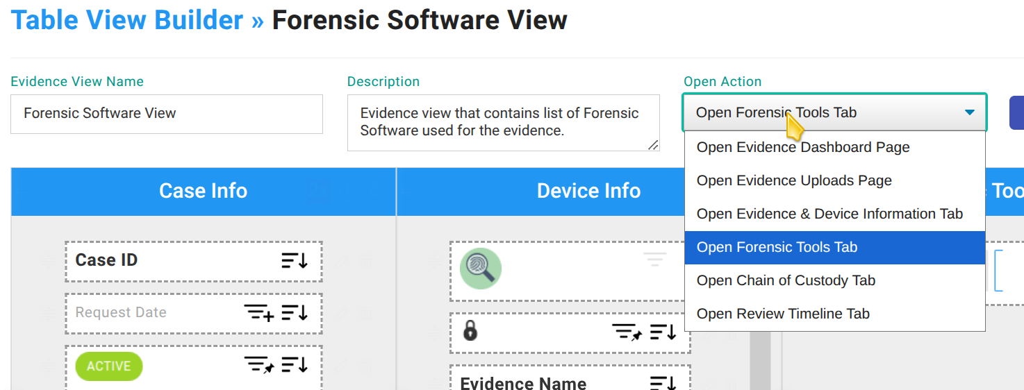 - You have the option to set where a listing view will take a user when the listing is clicked on. For example, if you are in a Forensic Tool View, you can send them to the Foresic Tool Tab of the Evidence Page. This helps if you have a preferred tab you more commonly use when opening an evidence item.
