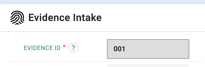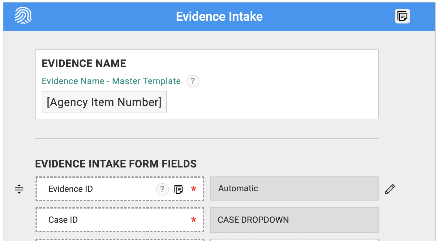 The current evidence id is now a default field which can now be configured to a desired template within the form builder. Simply go to the form builder and click on the edit icon next to the Evidence ID field: