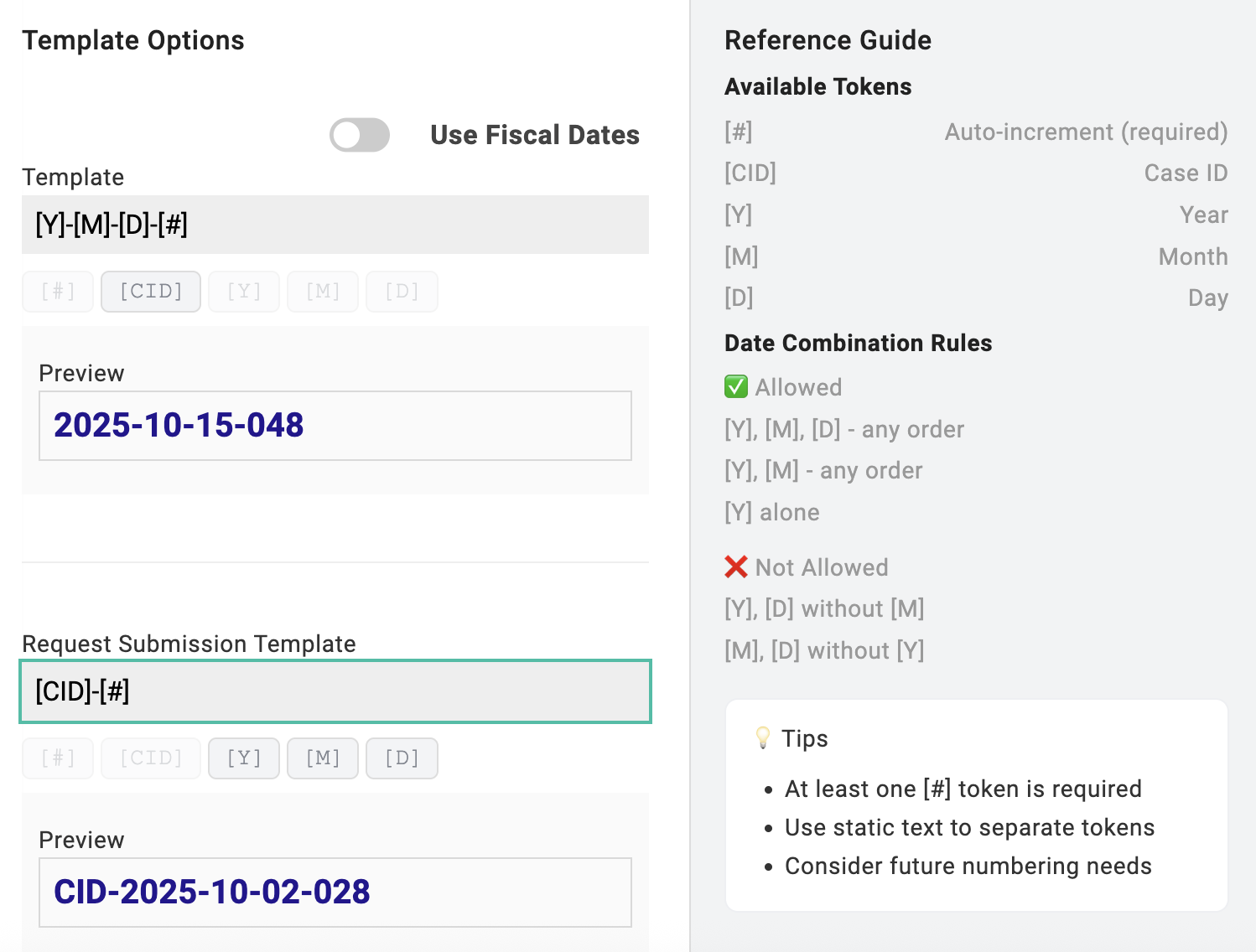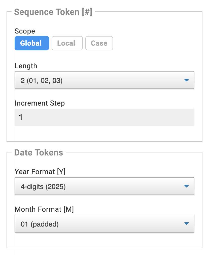 By inputting the appropriate tokens from the right hand side, you can build your template however you like. The template will interpret the token as the intended value such as [Y] for the year and [#] for the number.
