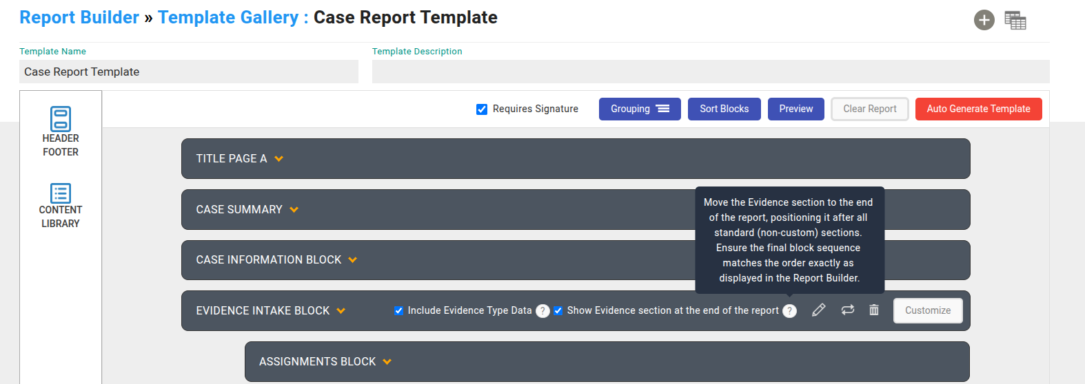 - Granted users the option to select whether evidence is shown at the end of non-custom sections or displayed exactly as arranged in the builder